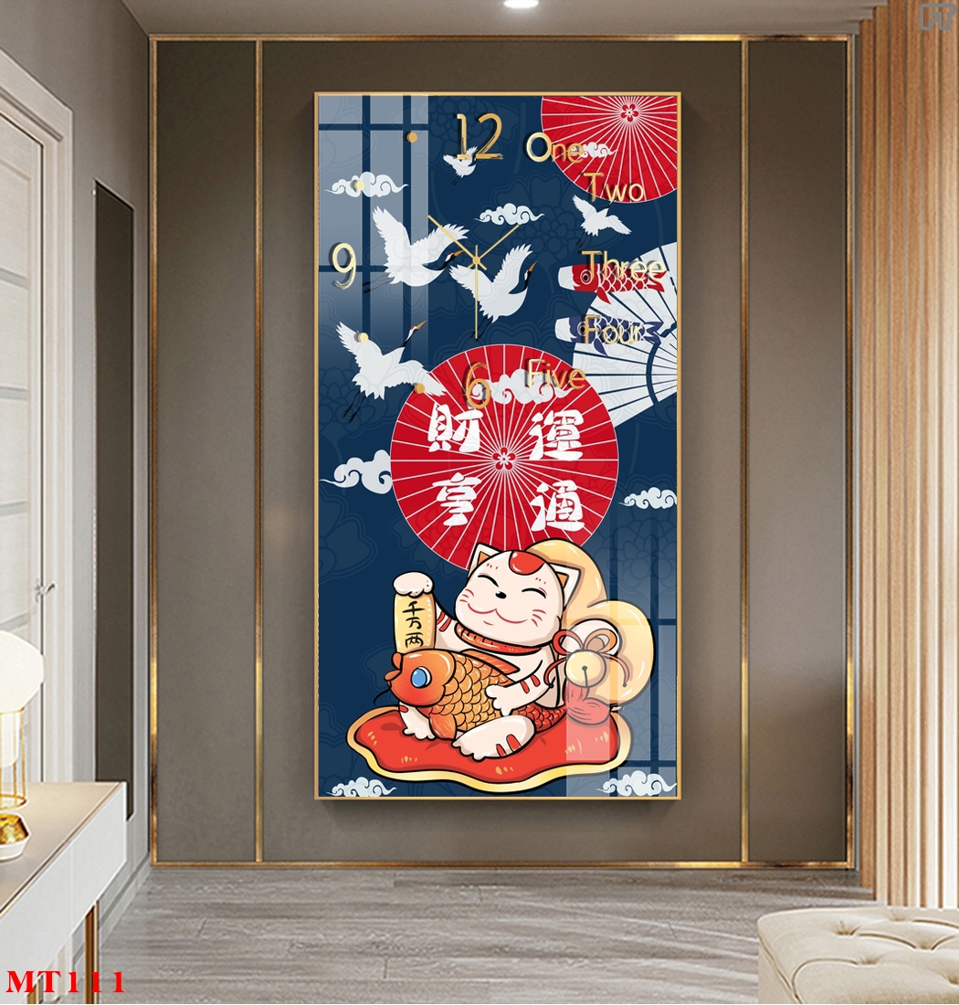 Đồng hồ tráng gương Mèo Thần Tài dáng dọc