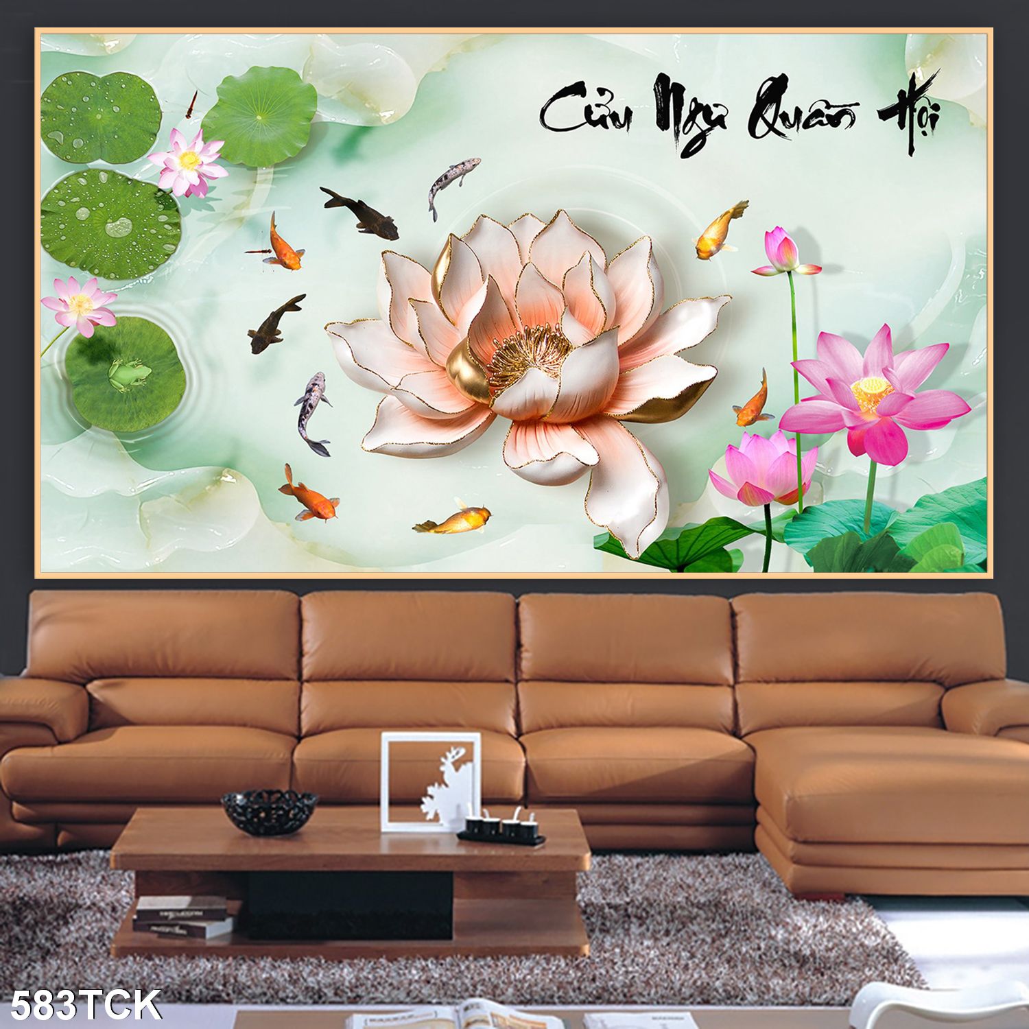 Tranh treo tường hoa sen cá koi, cá chép trang trí phòng khách, quà tặng tân gia
